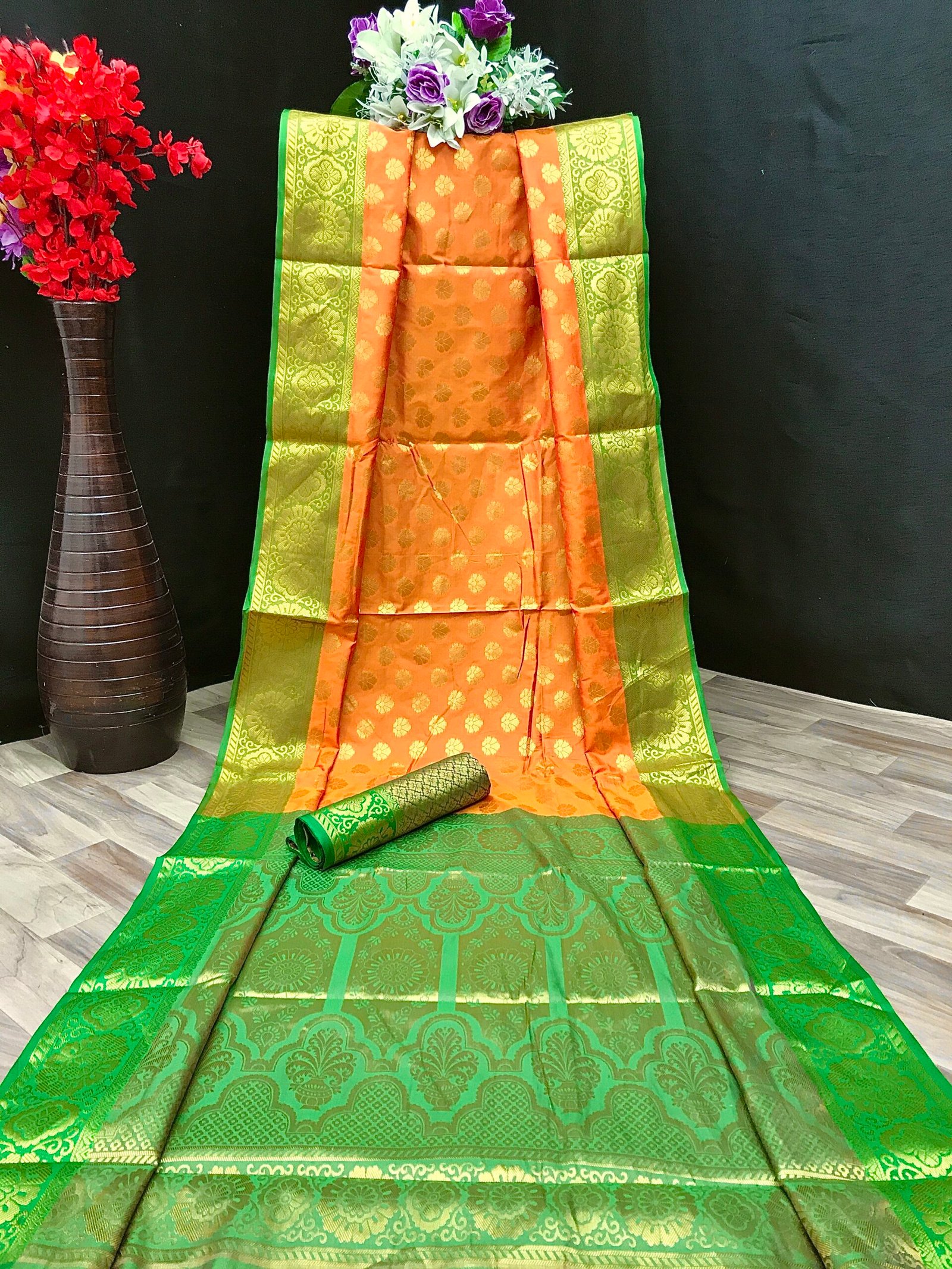 Add a touch of royal elegance to your ethnic collection with this stunning Banarasi Butti Saree, crafted to reflect timeless tradition and graceful style. The saree features a vibrant orange body beautifully adorned with classic golden butti motifs, giving it a rich and festive appeal.