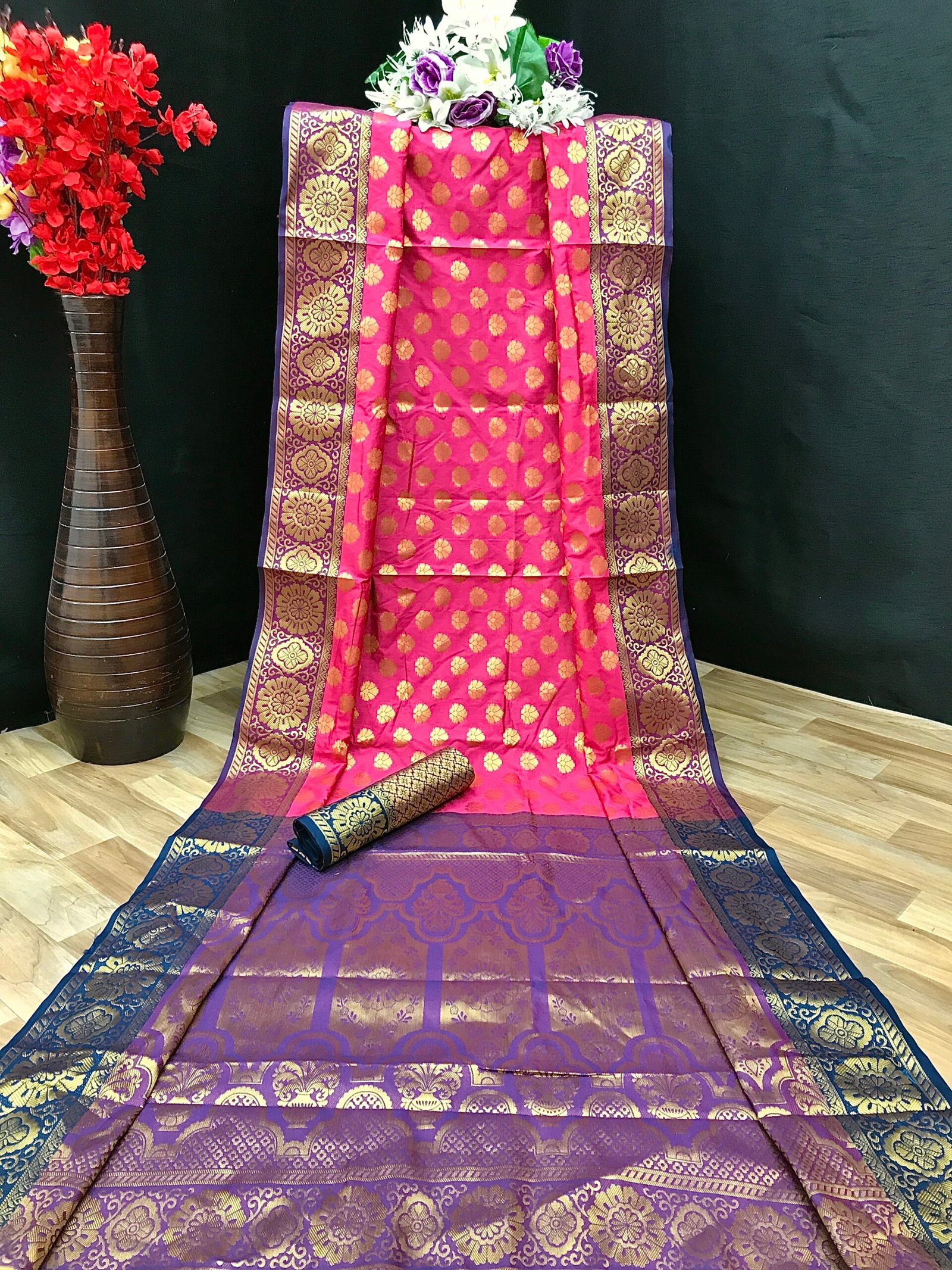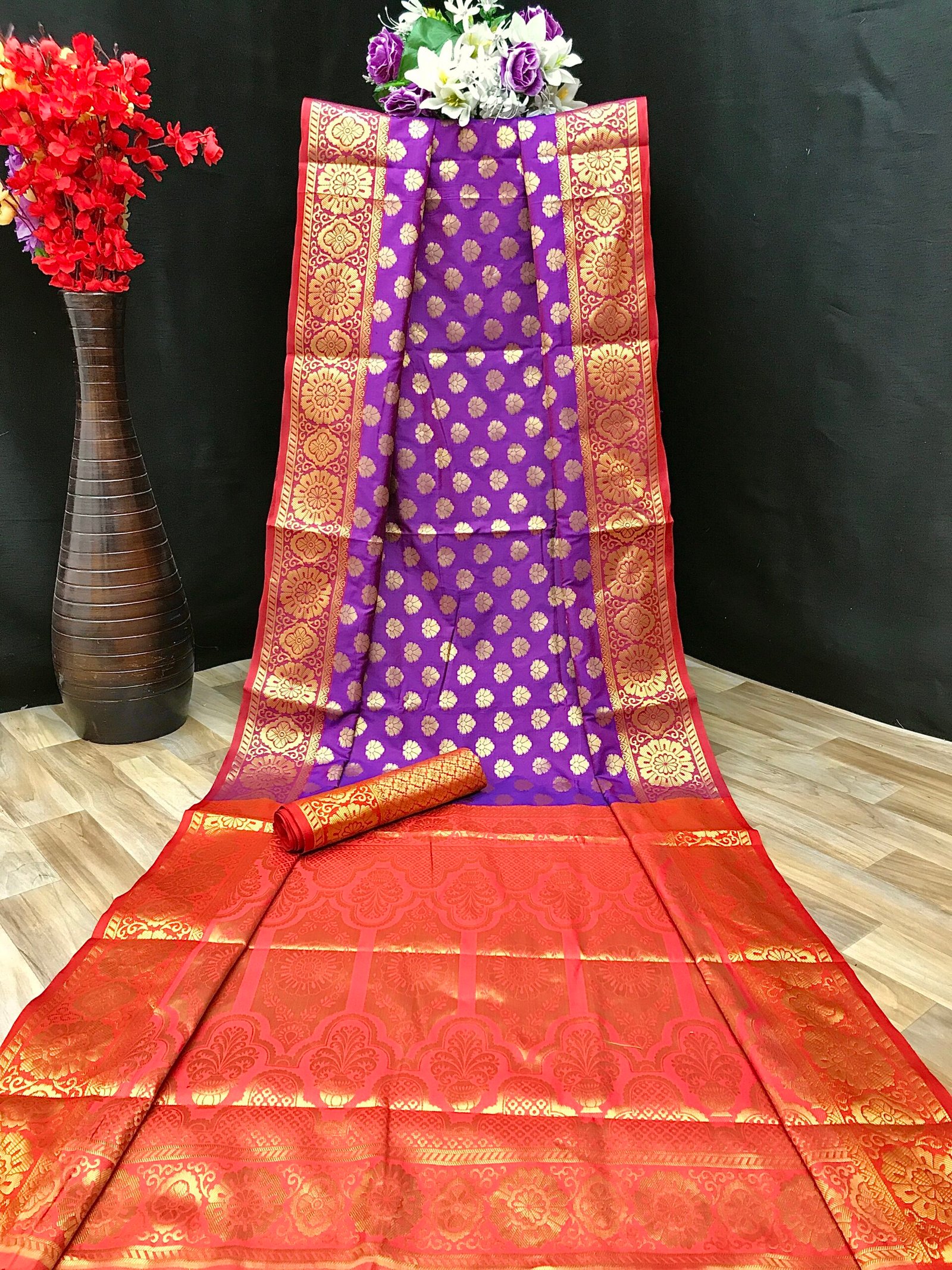 The highlight of this saree is its luxurious contrasting border and pallu in deep purple and green tones, intricately woven with traditional zari patterns that enhance its regal charm. The smooth Banarasi weave ensures a graceful drape, making it perfect for weddings, festive celebrations, poojas, and special occasions.