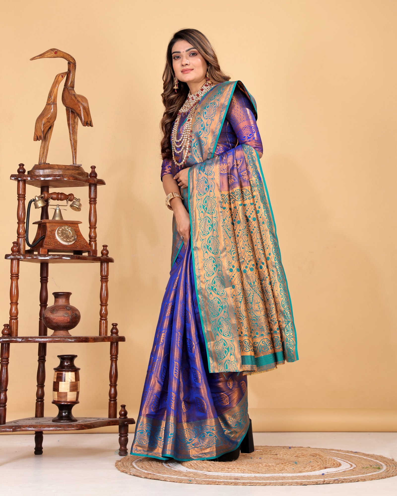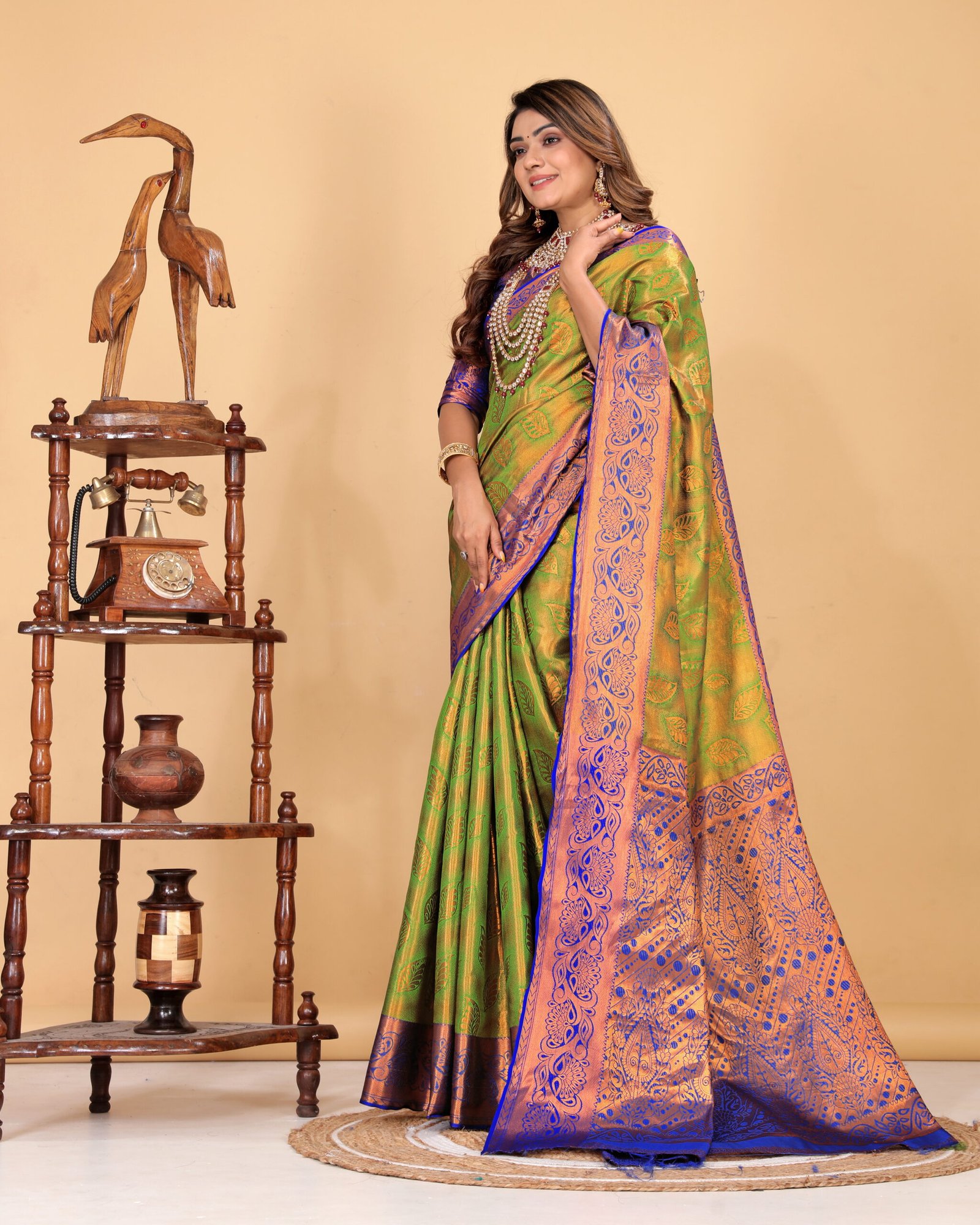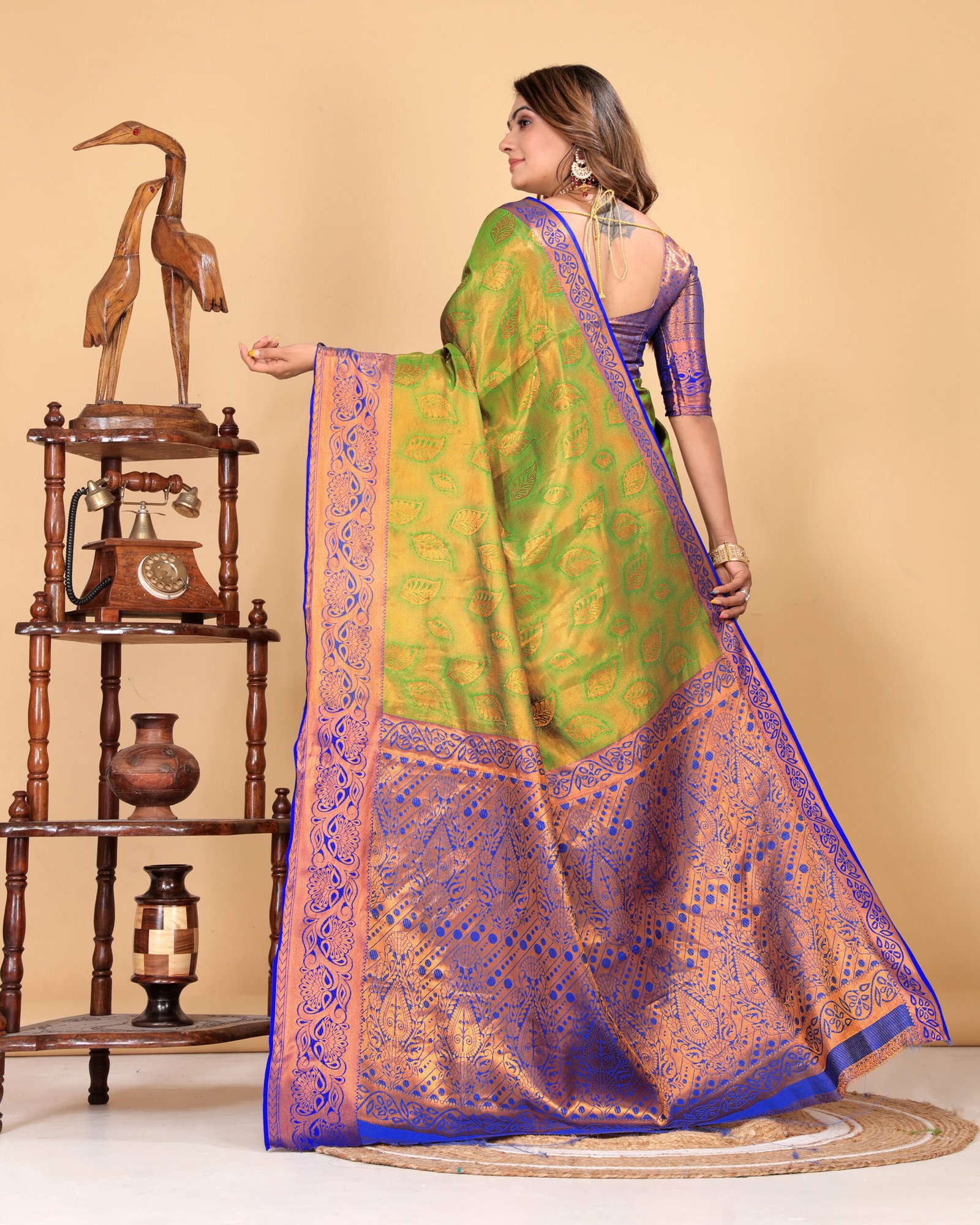 The contrasting royal blue and copper-toned border and pallu add a regal charm, highlighted with detailed zari work that enhances its luxurious appeal. The smooth texture and graceful drape make it ideal for weddings, festive occasions, cultural celebrations, and special events.