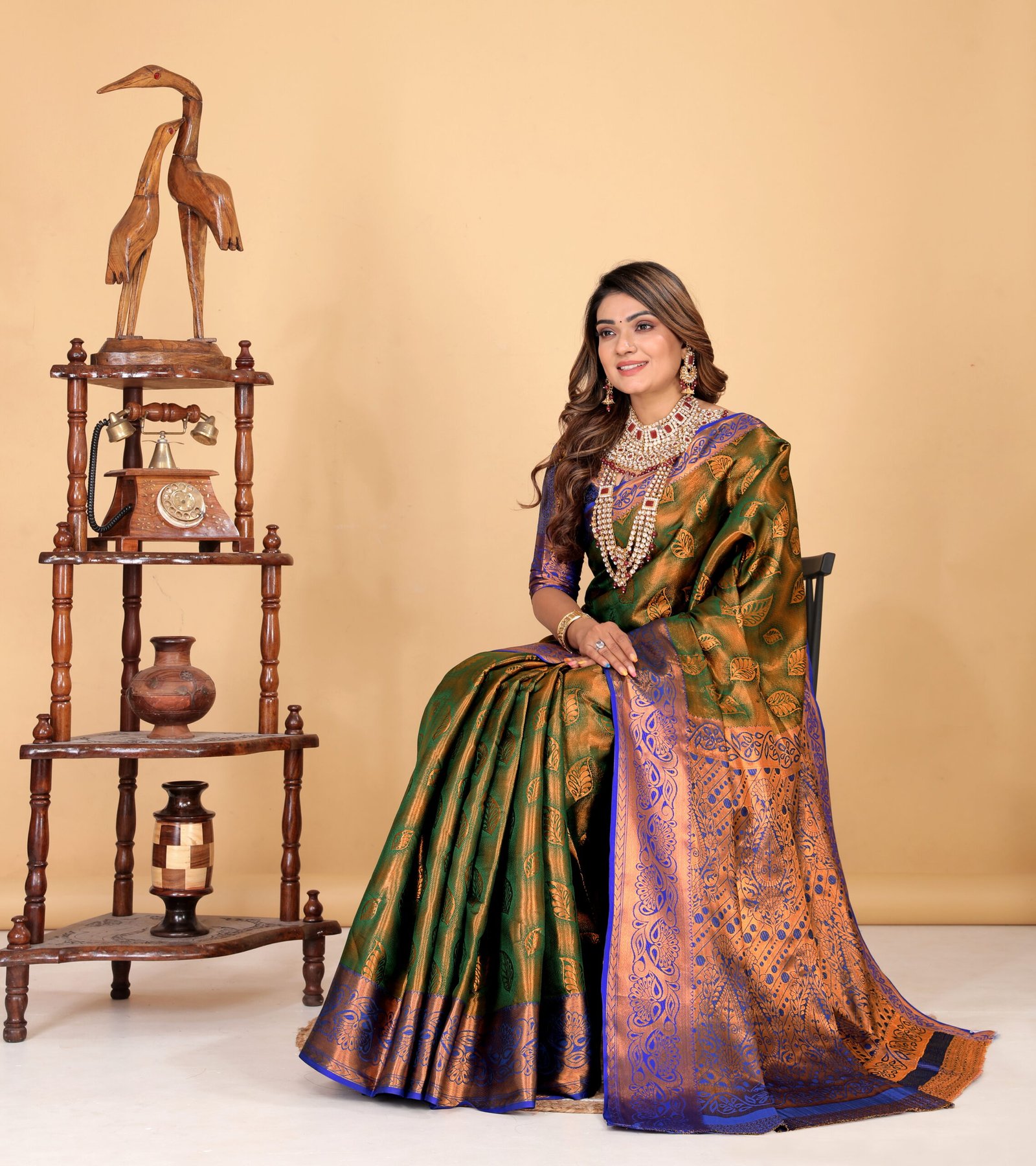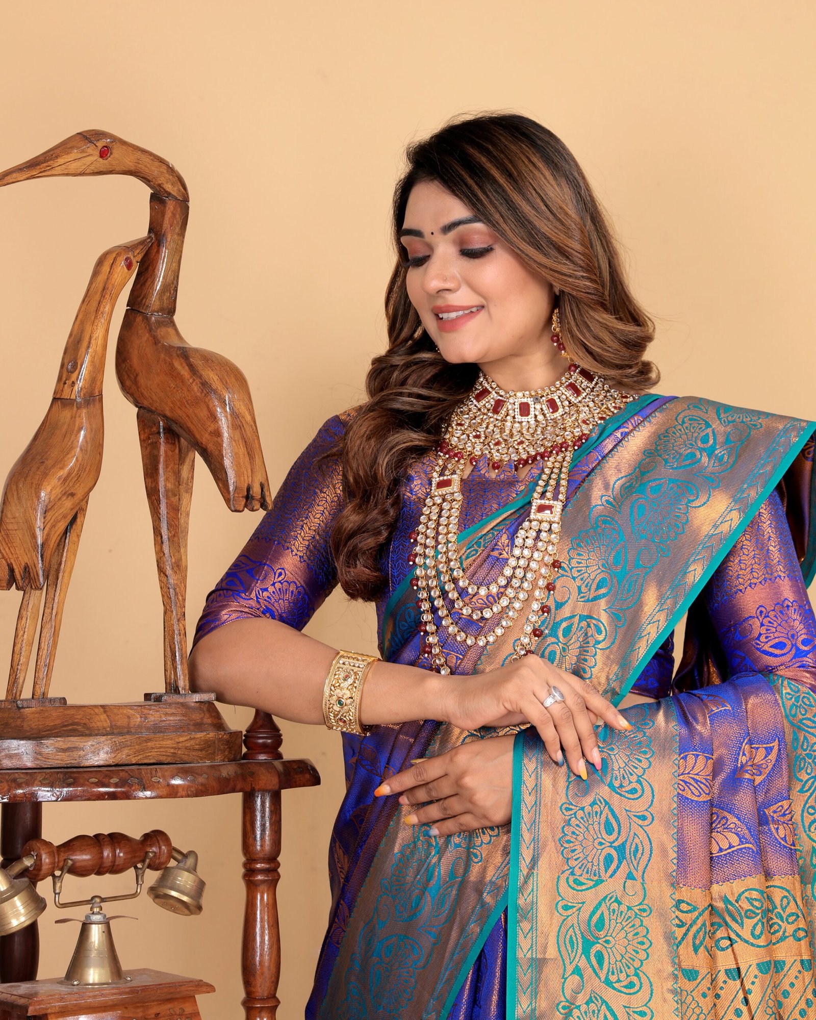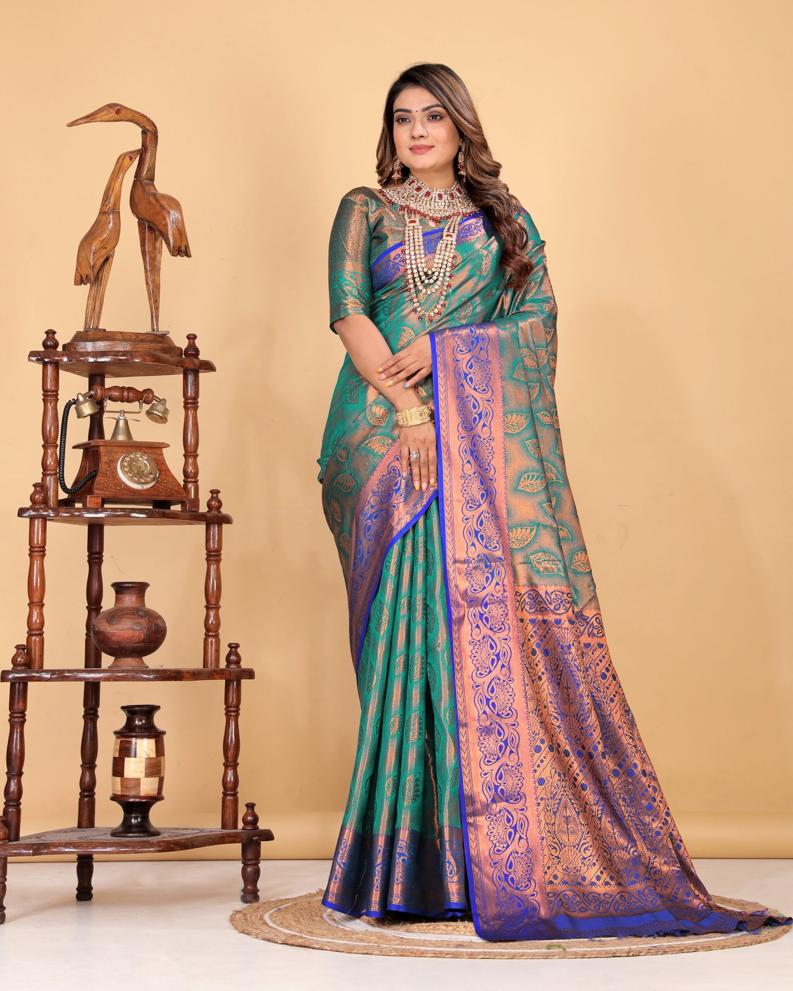 The contrasting royal blue and copper-toned border and pallu add a regal charm, highlighted with detailed zari work that enhances its luxurious appeal. The smooth texture and graceful drape make it ideal for weddings, festive occasions, cultural celebrations, and special events.