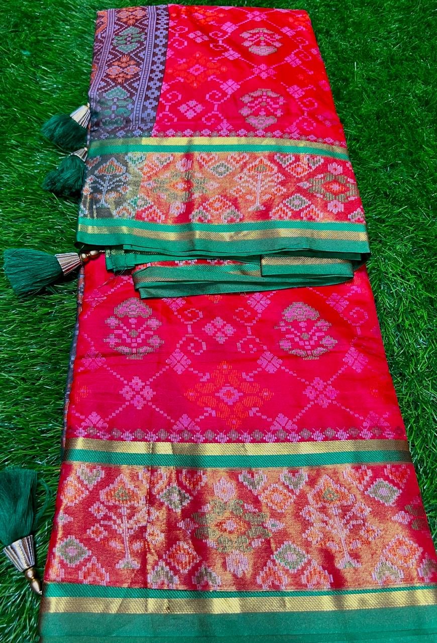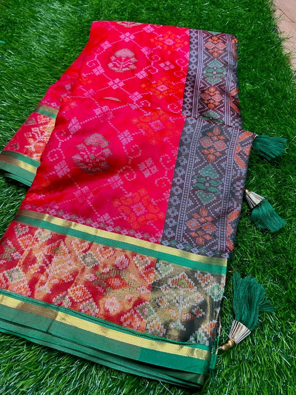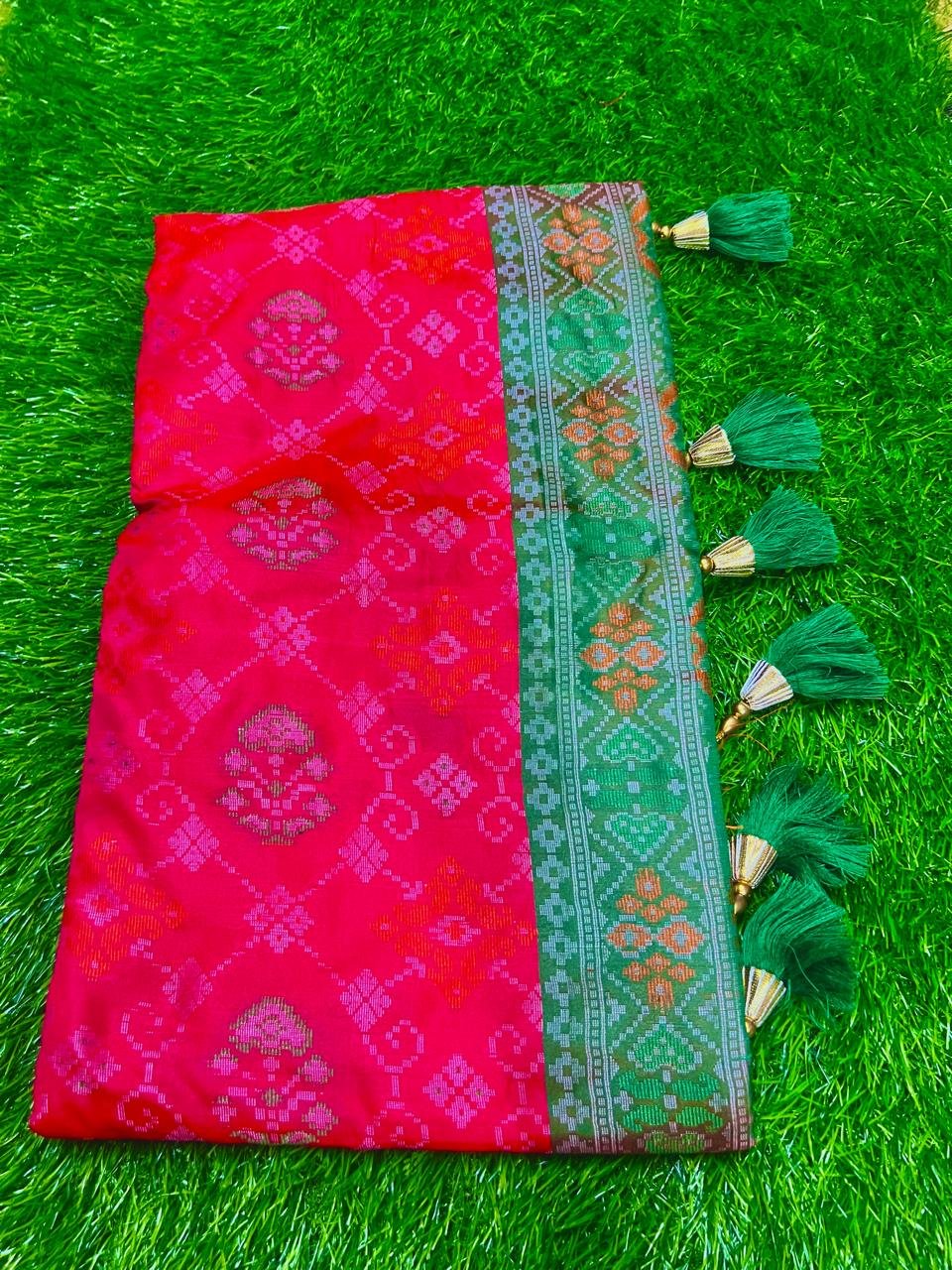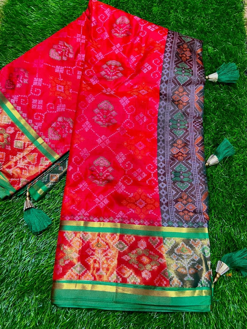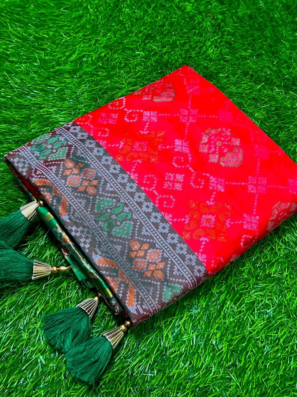 Designed in a striking red base with classic Patola geometric and floral motifs, the saree is beautifully complemented by a contrasting intricate border and elegant pallu with tassel detailing. The smooth silk fabric ensures a graceful drape, vibrant color retention, and all-day comfort.