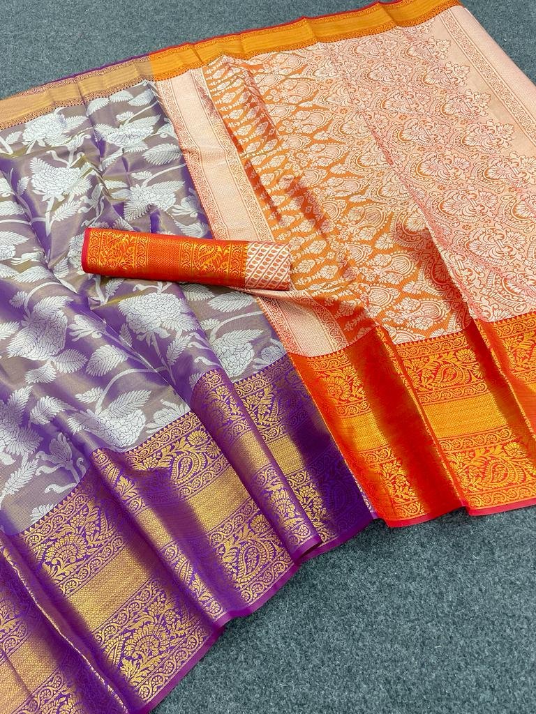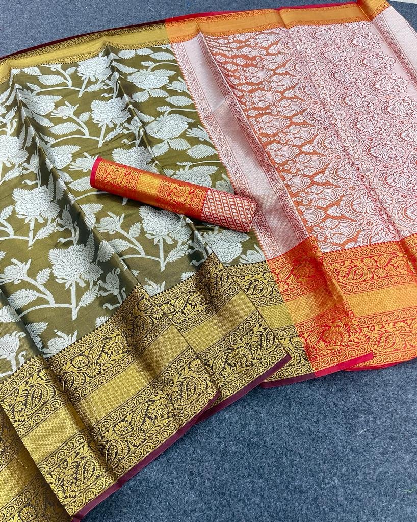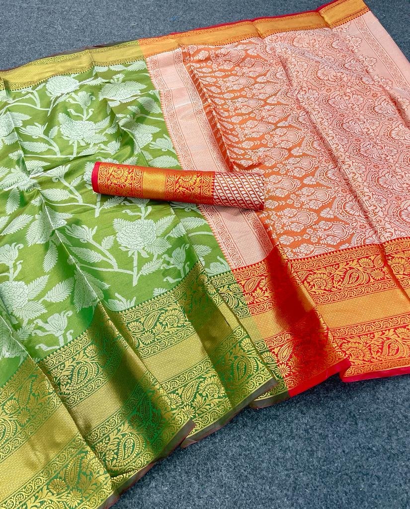The smooth silk fabric offers a luxurious feel and a graceful drape, making it comfortable to wear for long hours. The intricate motifs across the body combined with a finely detailed pallu enhance its festive charm, making it an ideal choice for weddings, celebrations, and special occasions.